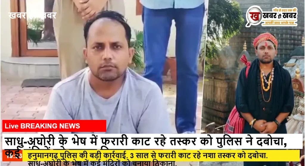हनुमानगढ़: राजस्थान की हनुमानगढ़ पुलिस ने साधु और अघोरी के भेष में फरारी काट रहे नशा तस्कर गिरफ्तार किया है. पुलिस से बचने के लिए साधु का भेष धारण कर धार्मिक स्थलों और पहाड़ों पर नशा तस्करी का आरोपी घूमता रहा. हनुमानगढ़ एसपी हरिशंकर के निर्देशन मे टाउन पुलिस ने बड़ी कार्रवाई करते हुए चिट्टा सप्लाई के इनामी आरोपी को गिरफ्तार किया है. आरोपी पर एसपी ने इनाम घोषित किया हुआ था. आरोपी 3 साल तक साधु और अघोरी के भेष में रहकर पुलिस से बचता रहा, लेकिन सोमवार को पुलिस ने उसे हरियाणा से धर दबोचा.