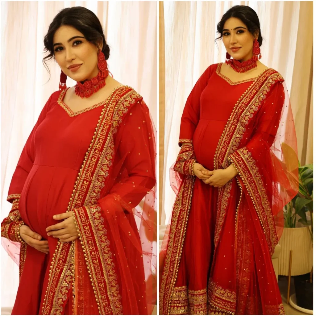 शीना बजाज ने रेड कलर का फ्लोर टच अनारकली सूट पहना है. साथ ही मैचिंग में स्टाइलिश नेकलेस कैरी किया हैं. बन हेयर स्टाइल और मेकअप के साथ उनका ये लुक क्लासी लग रहा है. उनका यह प्रेग्नेंसी लुक बहुत ही बेहतरीन लग रहा है. सूट और दुपट्टे के किनारों पर एंब्रॉयडरी वर्क हुआ है.