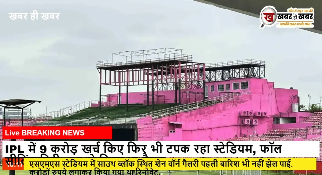 जयपुर: राजधानी जयपुर के सवाई मानसिंह स्टेडियम में स्थित साउथ ब्लॉक का IPL मुकाबलों के दौरान रिनोवेशन किया गया था. साउथ ब्लॉक गैलरी में इस दौरान मैच देखने के लिए दर्शक दीर्घा संख्या में बढ़ोतरी की गई थी. रिनोवेशन के बाद इसे शेन वॉर्न गैलरी का नाम दिया गया था. करोड़ों रुपये लगाकर इस साउथ ब्लॉक को रिनोवेट किया गया था. यह पूरा रिनोवेशन का काम राजस्थान रॉयल्स फ्रेंचाइजी द्वारा किया गया था, लेकिन साउथ ब्लॉक स्थित शेन वॉर्न गैलरी पहली बारिश भी नहीं झेल पाई.