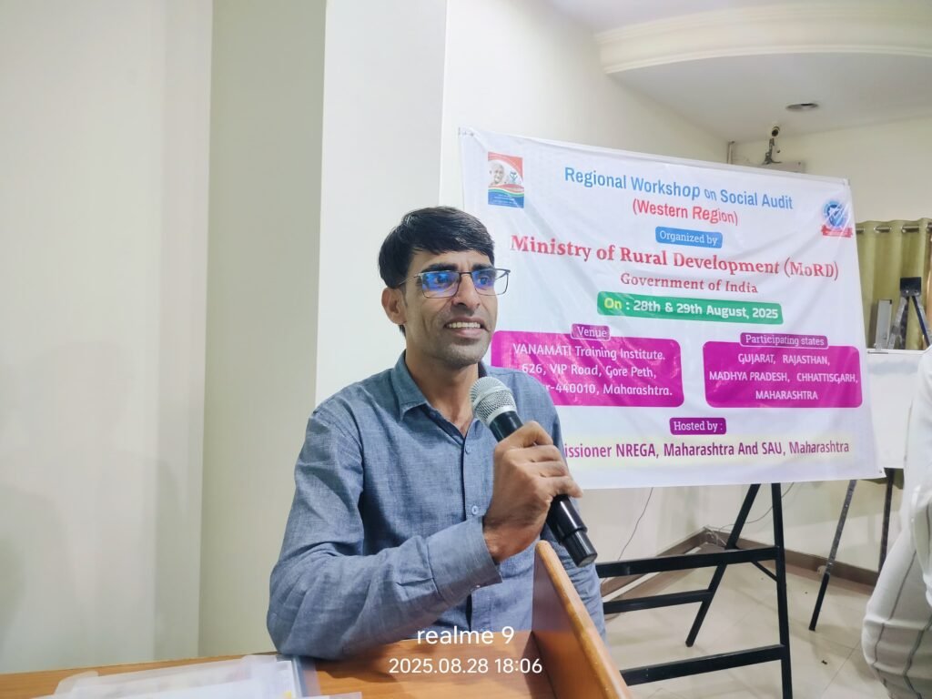 28 से 29 अगस्त 2025 को वानामती ट्रेनिंग इंस्टिट्यूट, नागपुर (महाराष्ट्र) में आयोजित रीजनल लेवल वर्कशॉप ऑन सोशल ऑडिट – वेस्टर्न रीजन में राजस्थान ने राष्ट्रीय स्तर पर अपनी उपलब्धियों और नवाचारों को प्रस्तुत किया। इस वर्कशॉप में राजस्थान, गुजरात, महाराष्ट्र, छत्तीसगढ़ और मध्य प्रदेश के प्रतिनिधि शामिल हुए। आयोजन Ministry of Rural Development, Government of India (MoRD) द्वारा किया गया।