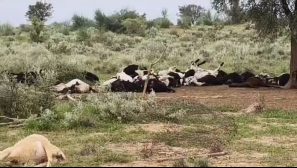 दियातरा। भाणेका गांव में आकाशीय बिजली गिरने से 13 भेड़ और 108 बकरियां मरी।शनिवार रात 11 बजे बरसात के साथ तेज गड़गड़ाहट के साथ आकाश आकाशीय बिजली गिरने से खेत मैं 121भेड़ बकरियों मरी।