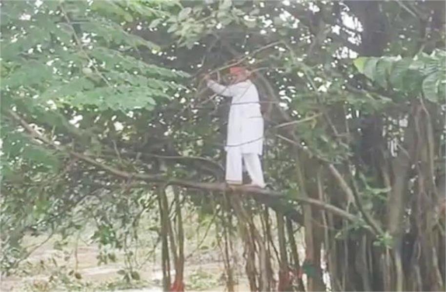 रोहतक में पेड़ों की कटाई रोकने बुजुर्ग बरगद पर चढ़ा, बोला- पेड़ काटे तो कर लूंगा आत्महत्या