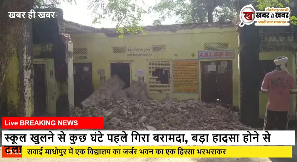 सवाई माधोपुर : जिले में विगत दिनों हुई बारिश के चलते जिले के कई स्कूल सहित पुरानी बिल्डिंग जर्जर हालत में हैं. सोमवार को जिले के चौथ का बरवाड़ा तहसील क्षेत्र के राजकीय उच्च माध्यमिक विद्यालय एचेर गांव में अल सुबह विद्यालय का बड़ा बरामदा एवं अन्य हिस्सा भरभराकर गिर गया. गनीमत यह रही कि घटना विद्यालय खुलने से कुछ घंटे पहले हो गई, नहीं तो बड़ा हादसा हो सकता था. शिक्षा विभाग की ओर से इस भवन को जर्जर तो घोषित किया हुआ था, लेकिन उसे हटाया नहीं गया था. ऐसे में शिक्षा विभाग की यह लापरवाही बड़ी घटना का कारण बन सकती थी, जिसके चलते लोगों में नाराजगी है.